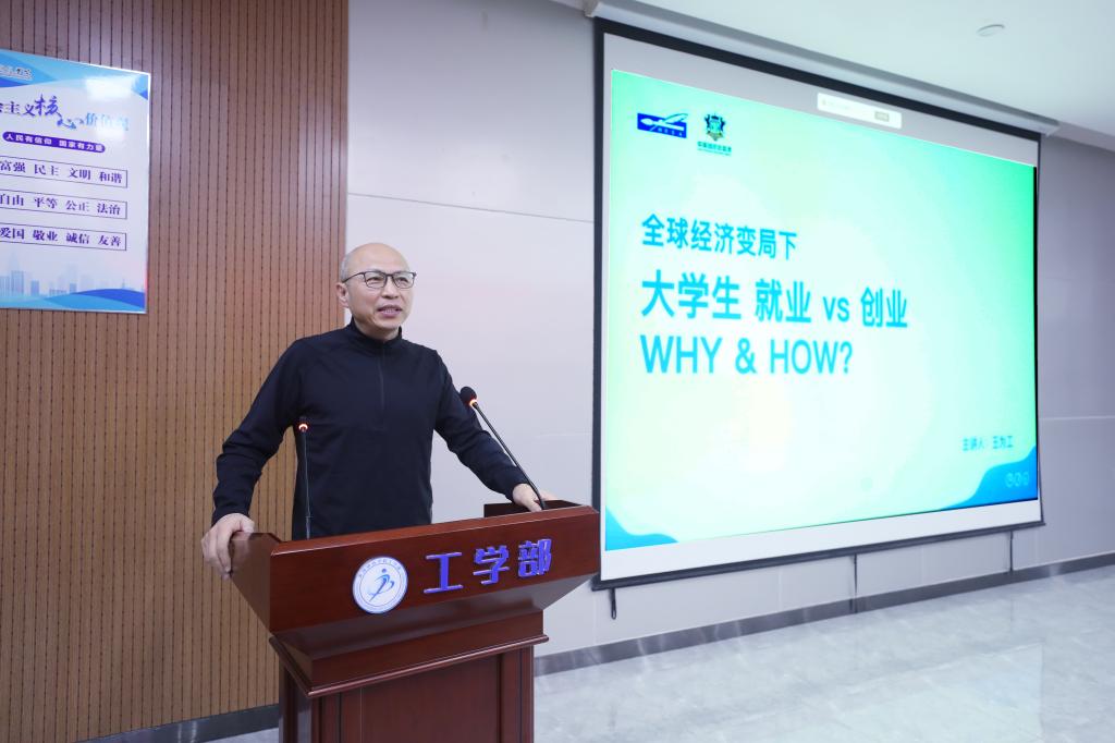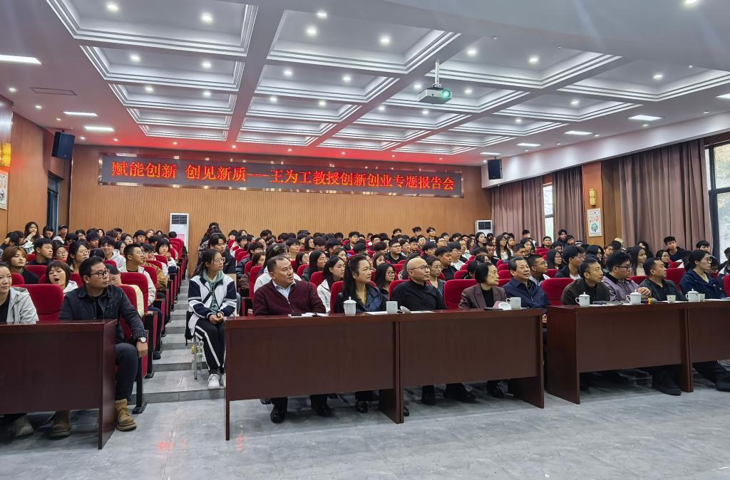 王为工教授在创新创业领域拥有深厚的理论造诣和丰富的实践经验。在受聘为创新创业学院院长后,他为在场师生带来了一场精彩纷呈、启人心智的专题报告。他的报告高屋建瓴又深入浅出,话语如春风化雨,深深走进了青年学子的心里。报告中,前沿的理念与鲜活的案例交织,深刻的思考与实用的建议并存,极大地激发了师生们的创新思维与创业热情。在互动环节,学生们踊跃提问,与这位新院长进行了坦诚而深入的交流,现场思想碰撞,气氛活跃。