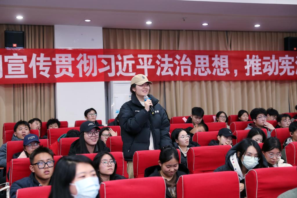 罗煜在致辞中介绍了黄河科技学院法治教育理念与成效。作为全国第一所民办普通本科高校,学校始终坚持“法治育人”理念,将法治教育纳入立德树人体系,融入人才培养全过程,将法治教育与思想政治教育、专业教育、素质教育有机融合,召开法治工作会议,出台《深化法治工作实施方案》,建立师生和校外专家联合参加的普法社团,持续开展主题丰富、形式多样、涵盖全员的法治宣传教育,推动全校形成“尊法、学法、守法、用法”的法治文化氛围,构建起“课堂讲授、实践体验、文化浸润”三位一体的法治教育体系,学校先后获评全省依法治校示范校、省级文明校园标兵等。罗煜寄语学子,弘扬宪法精神,要做法治精神的笃信者、法治学问的勤勉者、法治秩序的守护者、法治阳光的播撒者,以法治信仰护航青春成长。