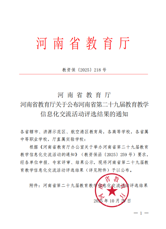 近日,河南省教育厅公布第二十九届教育教学信息化交流活动评选结果。我校师生在本次活动中表现突出,在多个项目类别中斩获佳绩,充分展示了学校在教育教学信息化领域的扎实基础与创新能力。