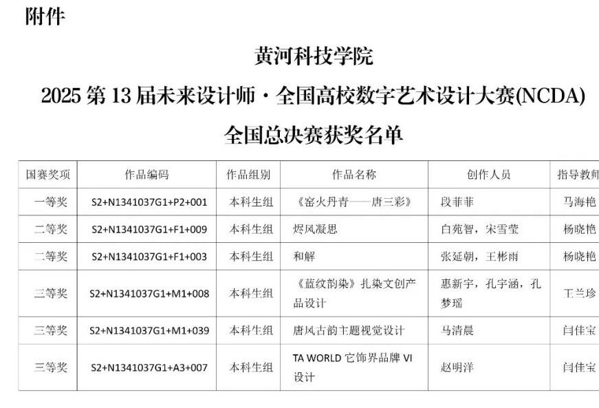 11月22日至24日,第13届未来设计教育论坛暨未来设计师大赛颁奖典礼在成都举行。我校师生在全国总决赛中斩获一等奖1项、二等奖2项、三等奖3项。马海艳、杨晓艳、王兰珍、闫佳宝被评为优秀指导教师。黄河科技学院荣获优秀组织奖。艺体学部设计艺术科教中心教师尹瑾、王兰珍赴成都参加学习培训及颁奖盛典。