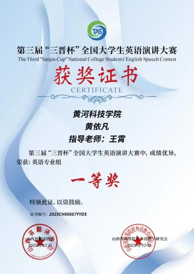 近日,由山西省人民政府外事办公室指导,山西省翻译协会、山西省高等院校外语教学研究会联合主办的第三届“三晋杯”全国大学生英语演讲大赛圆满结束。在决赛“精神薪传——让信仰在演讲中闪耀”主题竞赛中,我校商学部外语科教中心荣获优秀组织单位,学子张贝贝荣获特等奖,程祥麟、黄依凡荣获一等奖。