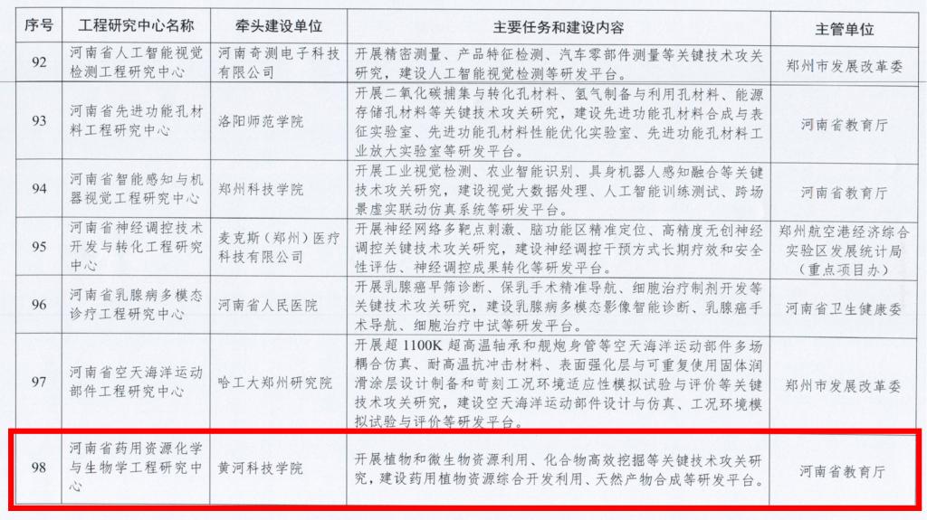 喜报!黄河科技学院获批建设河南省药用资源化学与生物学工程研究中心