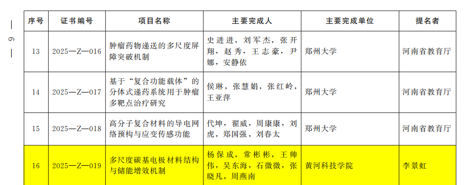 近日,河南省人民政府发布《关于2025年度河南省科学技术奖励的决定》,对全省科技创新优秀成果与个人予以表彰。本次共评选出获奖项目(人选)309 项(人),一批服务国家战略、支撑产业升级、保障粮食安全、彰显青年担当的高质量科技成果脱颖而出。我校在此次评选中表现优异,共斩获两项奖励,包括河南省自然科学奖二等奖1项、河南省科技进步奖三等奖1项。其中,我校执行董事、校长杨保成教授主持完成的“多尺度碳基电极材料结...